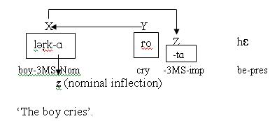 The examples (2-a) from Hindi-Urdu make the conditions of the definition for agreement more clear. The first condition is explained by the arrow which is drawn from ‘Y’ to ‘X’ and this tells us that there is a syntactic relationship between the verb and the subject in the clause. The nominal elements in these examples have their own inflection categories which we have called ‘z’, a subcategory of the grammatical category ‘Z’ i.e. the verbal inflection. The second part of the condition (b) i.e. ‘….and X’s relationship to z is independent of the nature or value of Y ’, can be understood if we compare the nominal inflections that occur in examples (2&2a). The O-feature of the nominal, ‘-A’, ‘3MS’of (2) changes to ‘-e’, ‘3MPl’ in the example (2a). This substitution of the nominal inflection is due to the desire of the speaker to change the number category of the nominal. This change in the form of nominal elements is independent of the nature and value of ‘Y’ i.e. a verb. The next condition is explained by pointing out the similarity between the nominal and verbal O-features in the examples. The last condition tells about the way the verb and the verbal inflection (which is a co-indexed property of the nominal inflections) combine and form the verb phrase. There is no problem in following the condition.